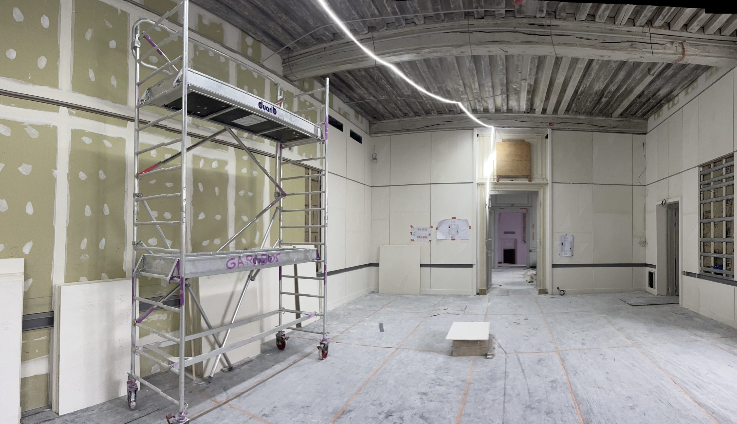Importante campagne de travaux pour la réhabilitation de l’immeuble en logements. Restauration des gypseries de la salle d’armes.